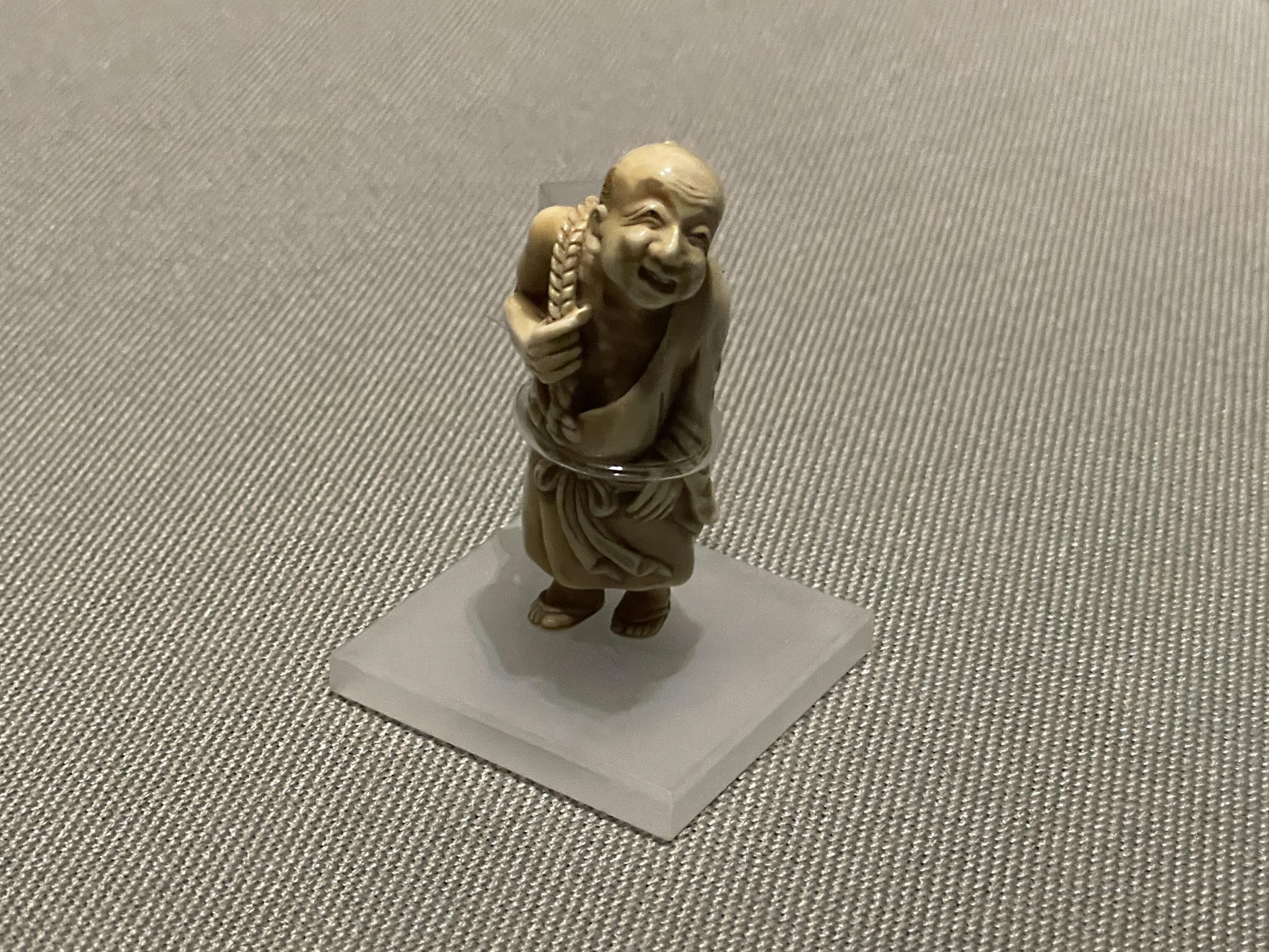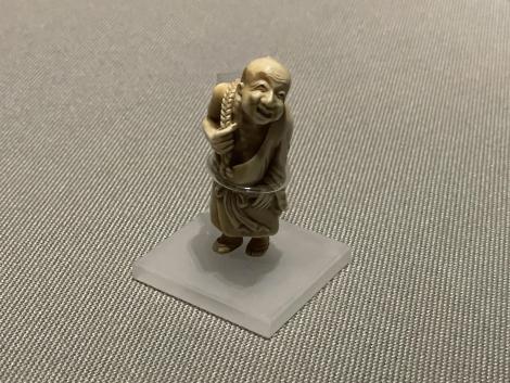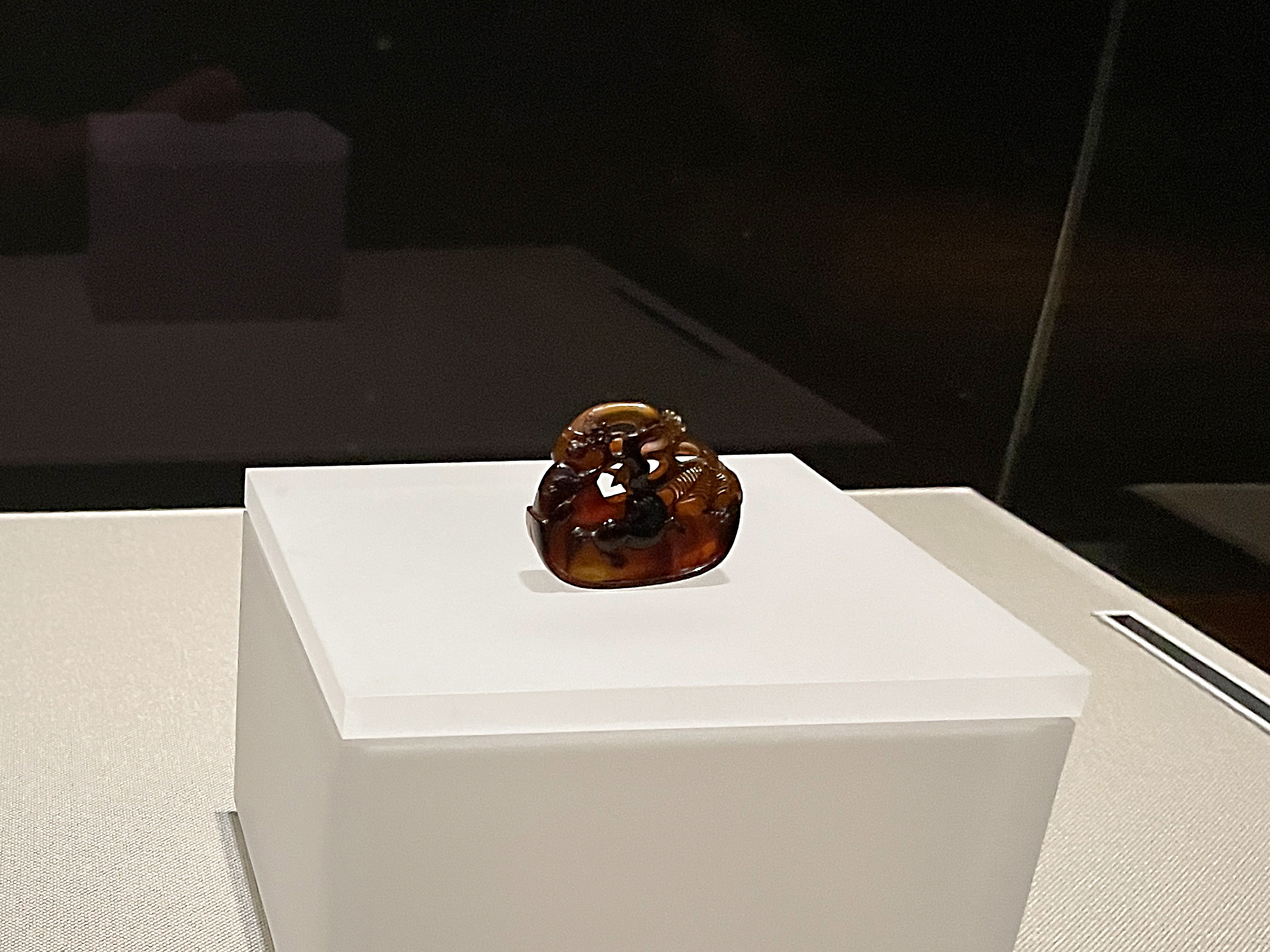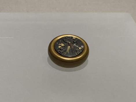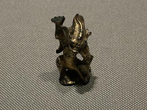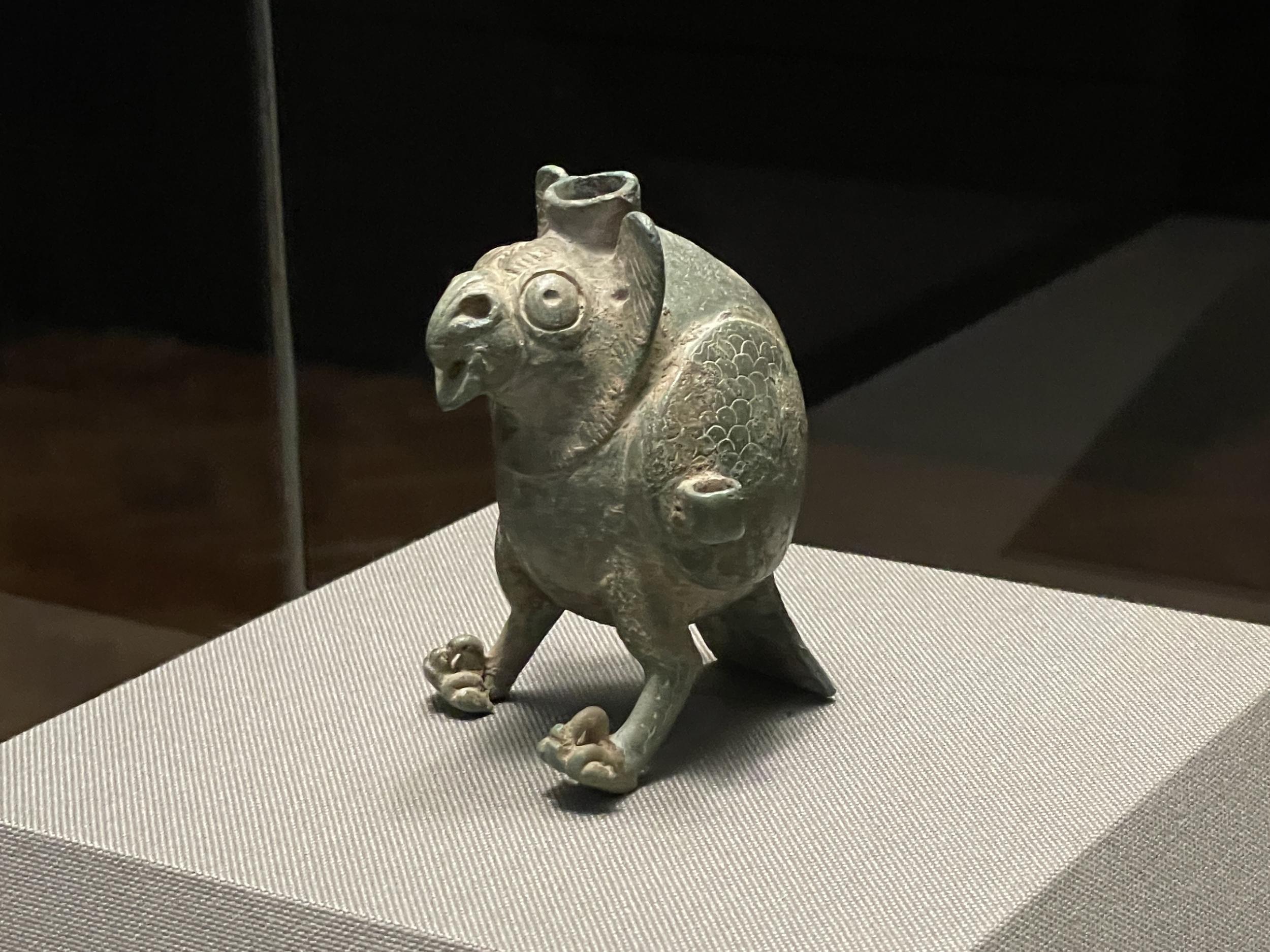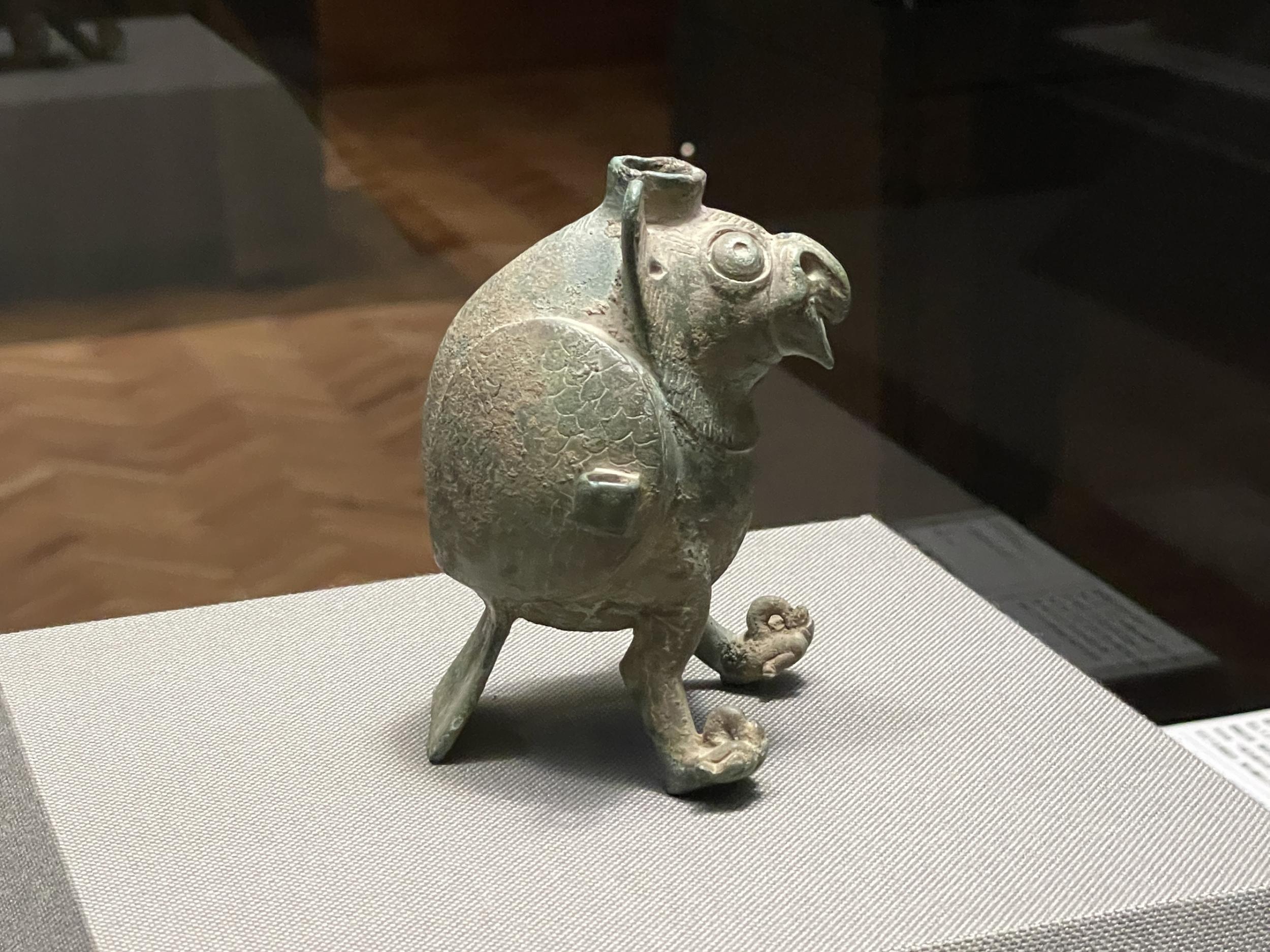 鴟鴞形水滴(後漢末~六朝時代・3~4世紀)、フクロウ型の水差しで、たぶん書道用具です。以前は他の展示品と一緒に壁面のケースに並べられていたのが独立して、当館広報大使の羽人に変わって展示室のセンターに昇格、どの方角からでもじっくり鑑賞できるようになってました。