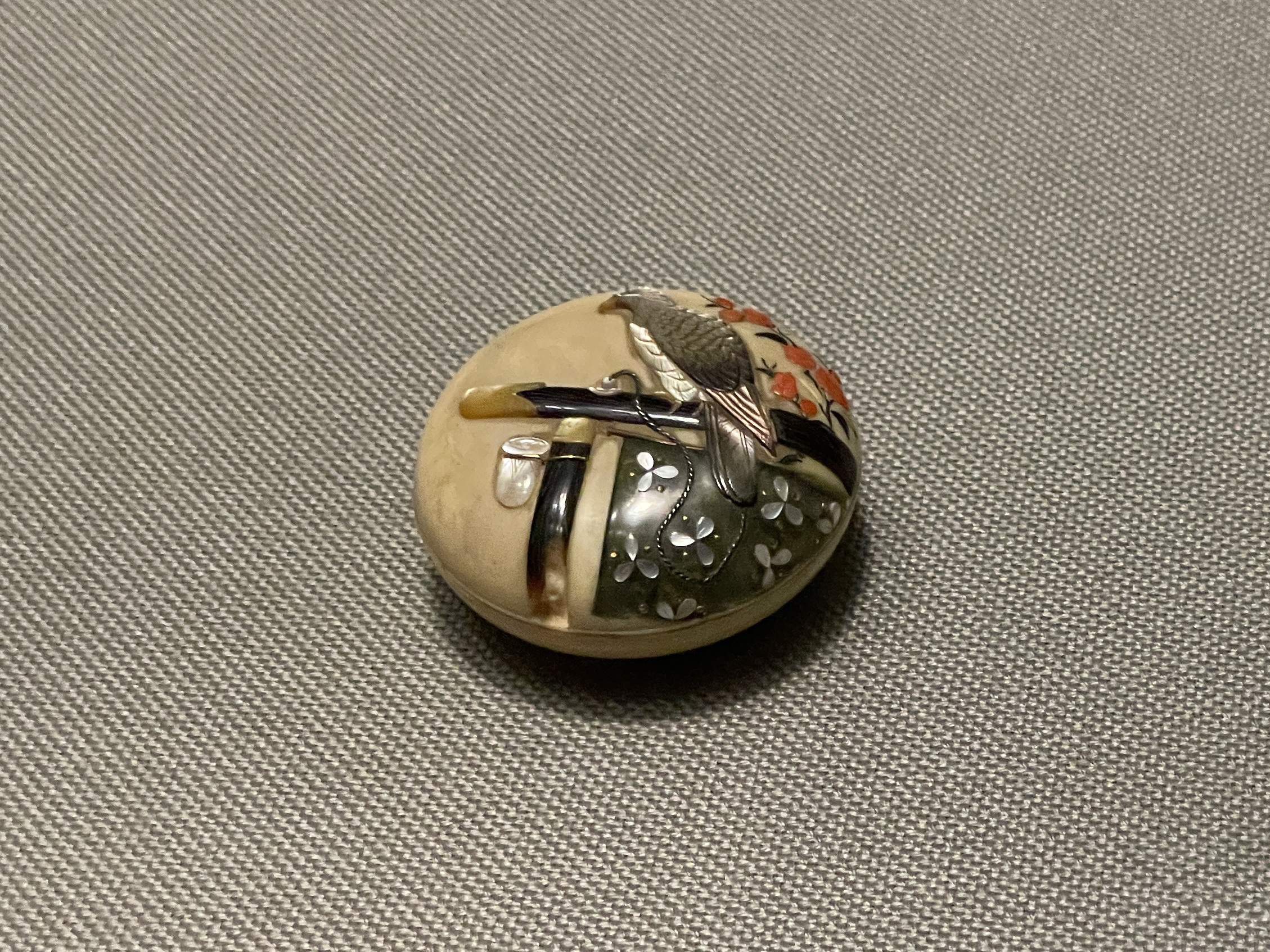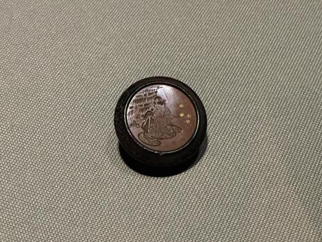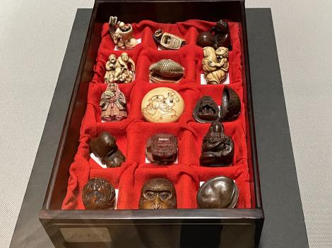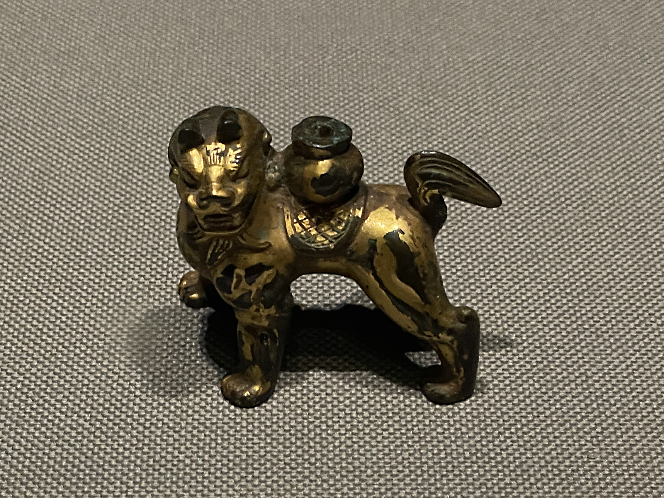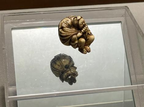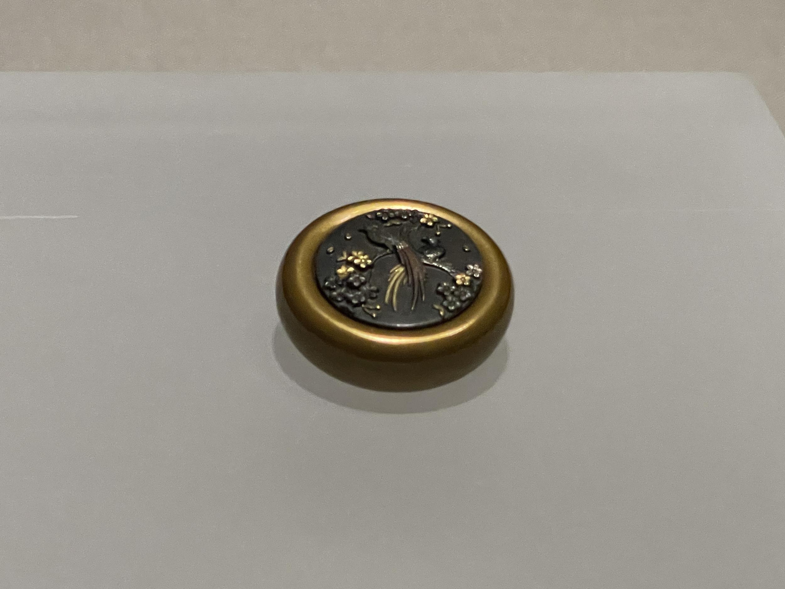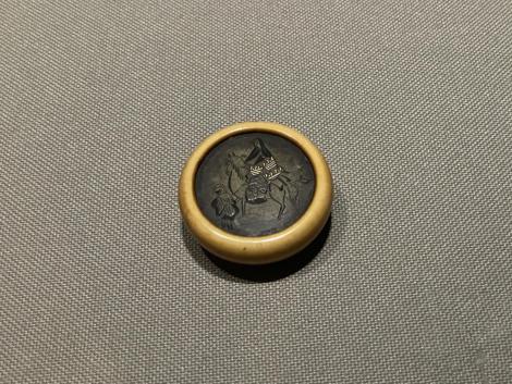 鴟鴞形水滴(後漢末~六朝時代・3~4世紀)、フクロウ型の水差しで、たぶん書道用具です。以前は他の展示品と一緒に壁面のケースに並べられていたのが独立して、当館広報大使の羽人に変わって展示室のセンターに昇格、どの方角からでもじっくり鑑賞できるようになってました。