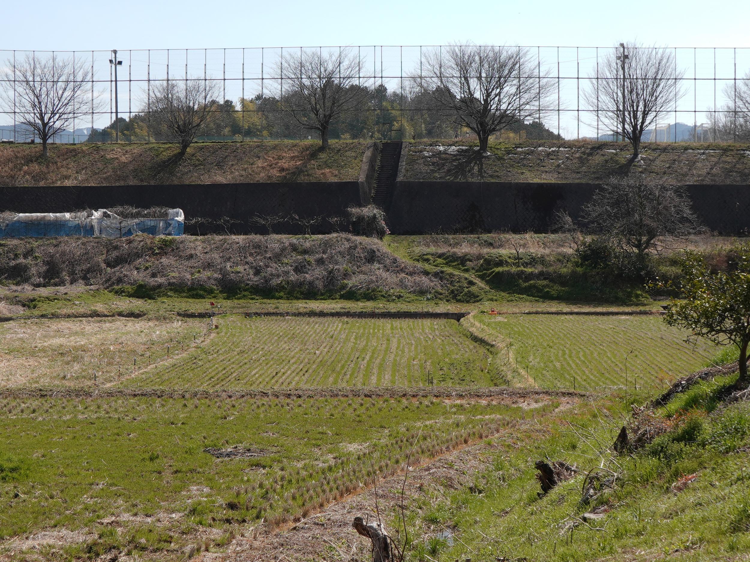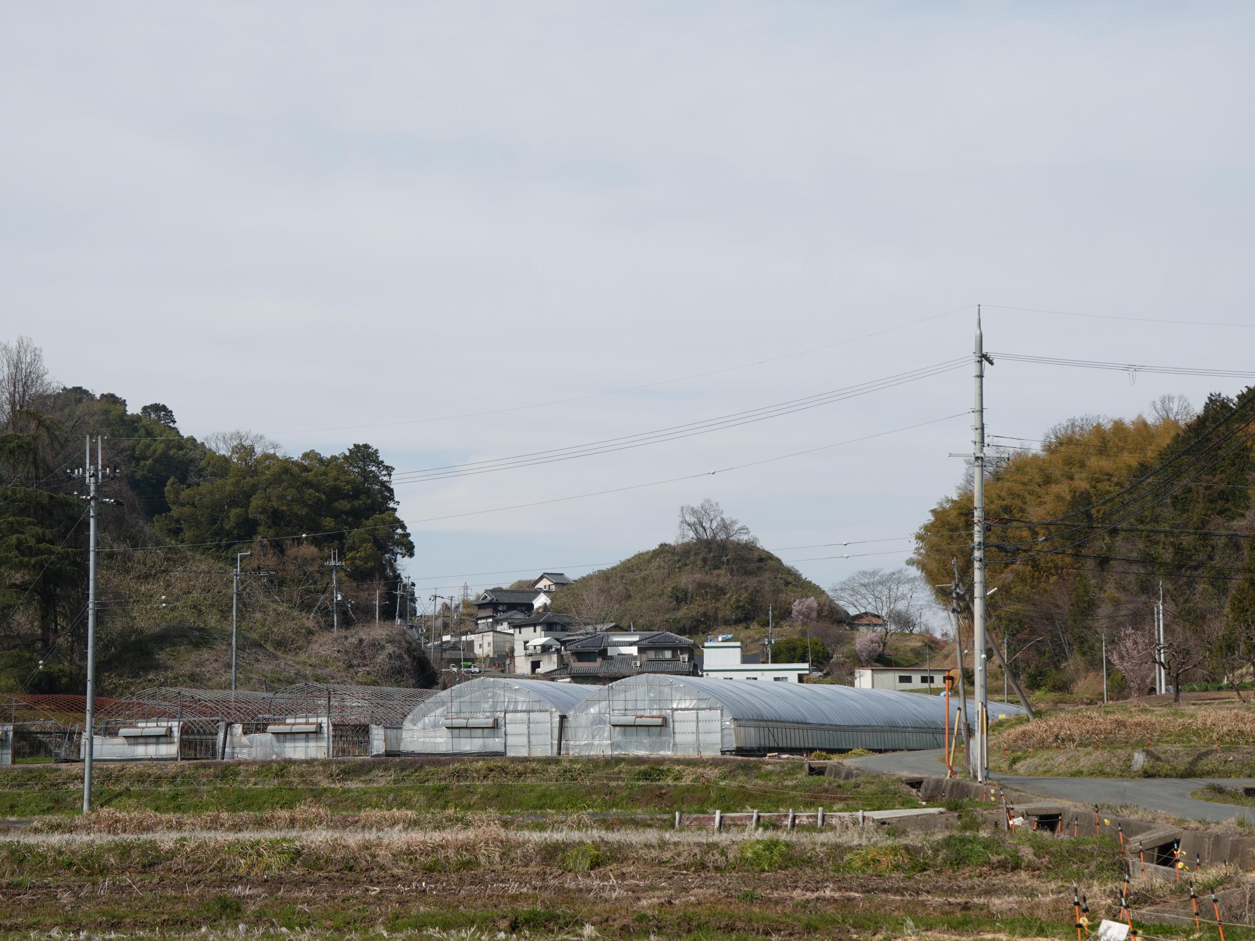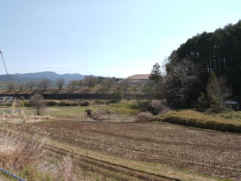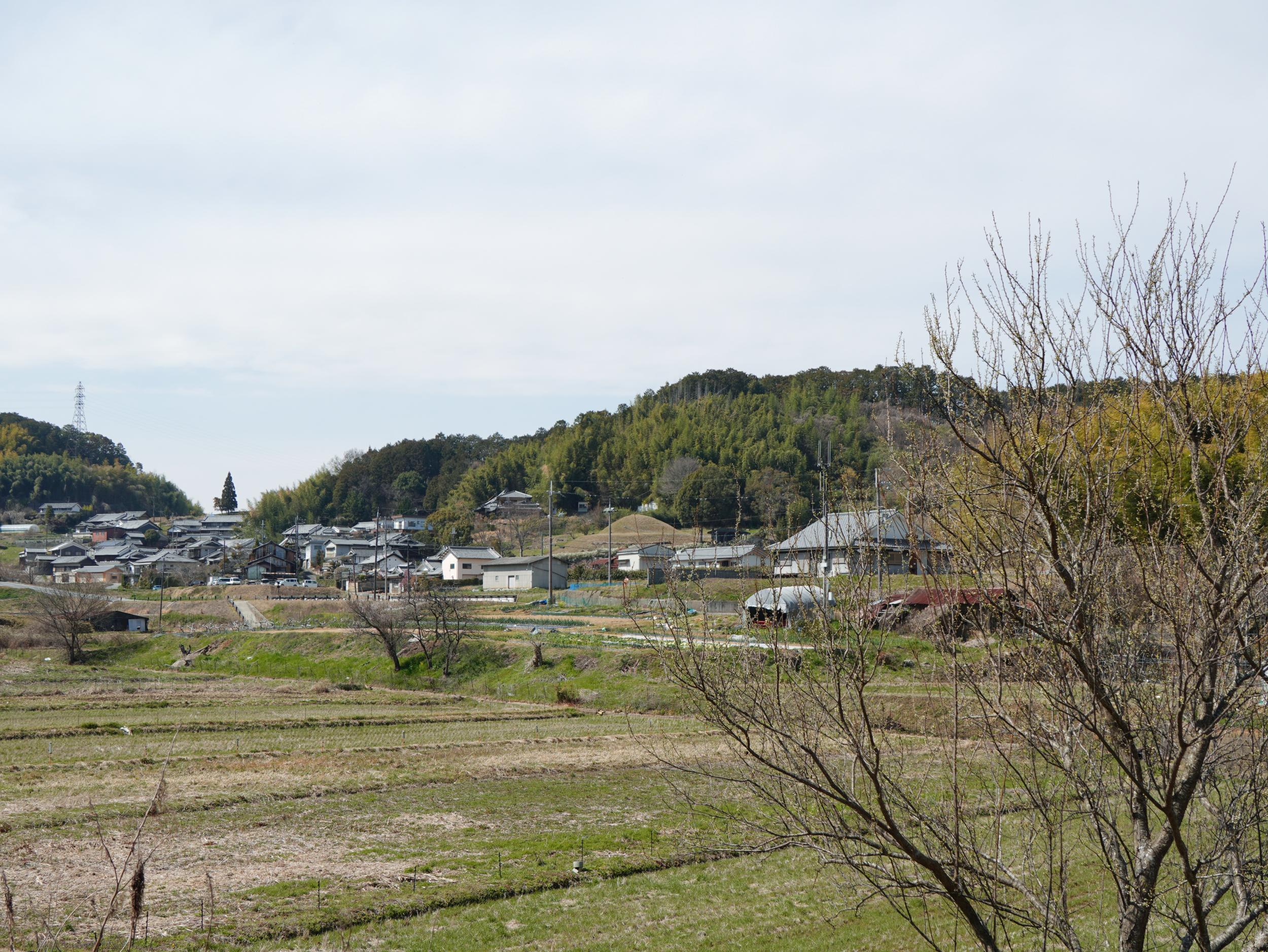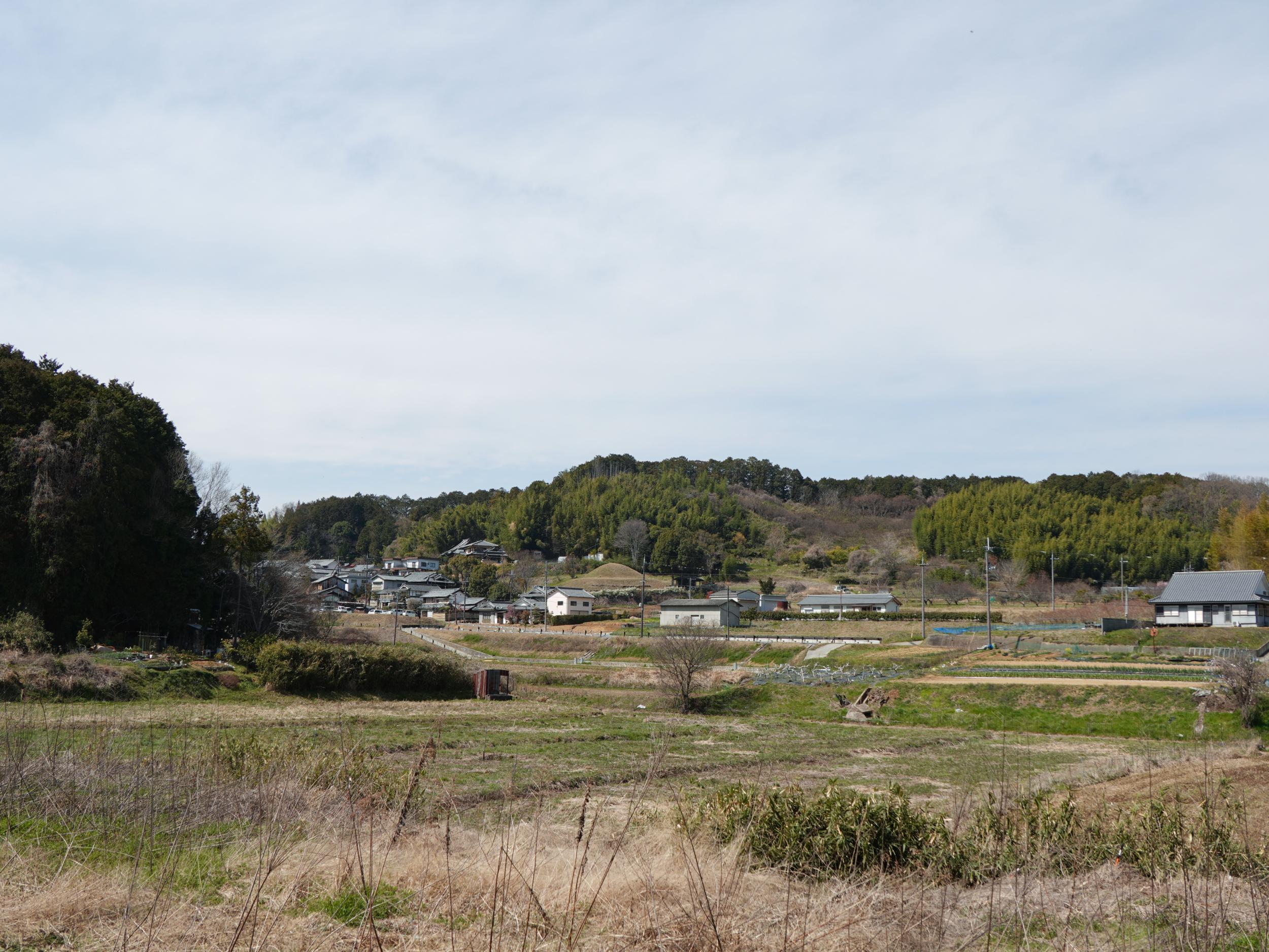 踏切を渡らずにV字に折り返し高取国際高校沿いの上り坂からマルコ山古墳の眺め。マルコ山古墳の向こう側の谷に牽牛子塚古墳があります。ひとつの谷にひとつのやんごとなき人の陵墓という飛鳥時代の決まりごとがあったのかも知れません。