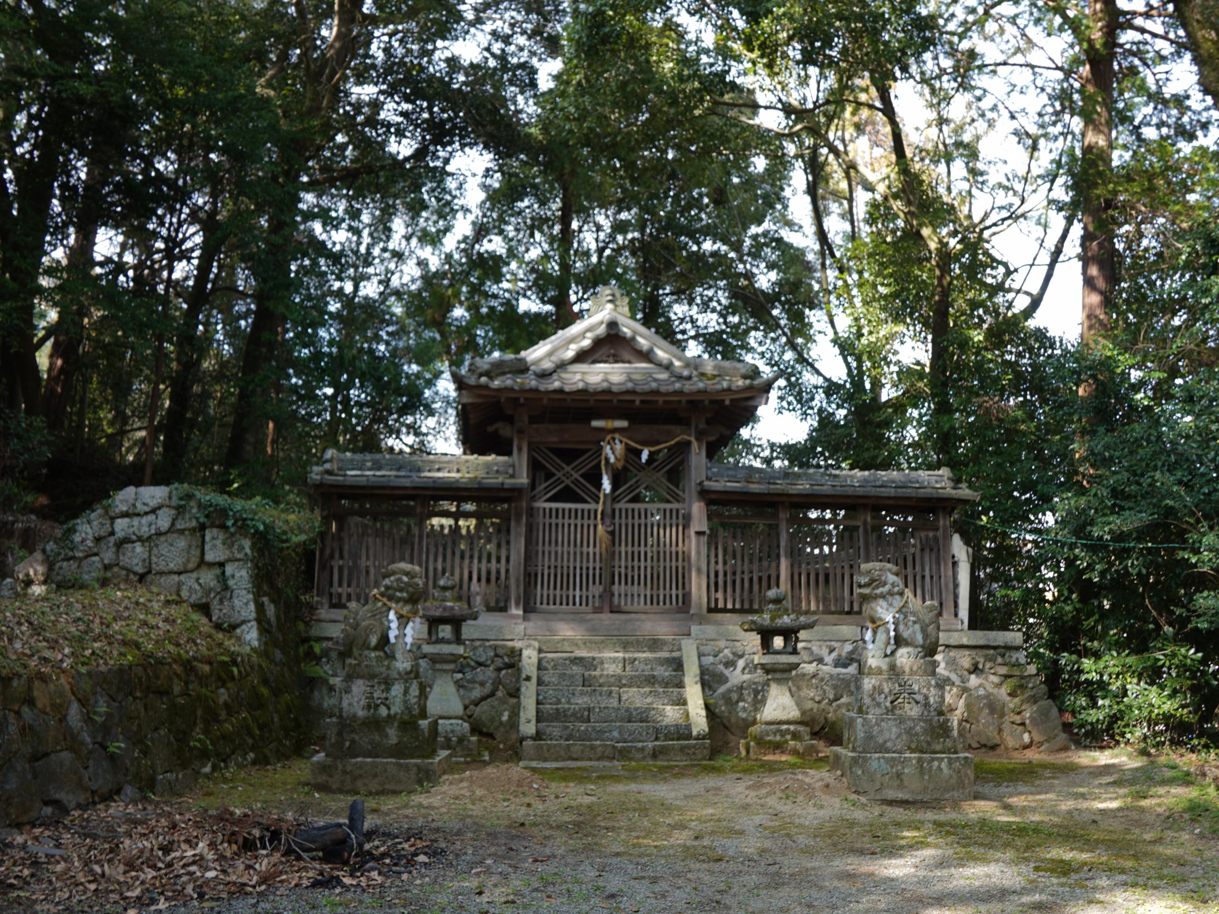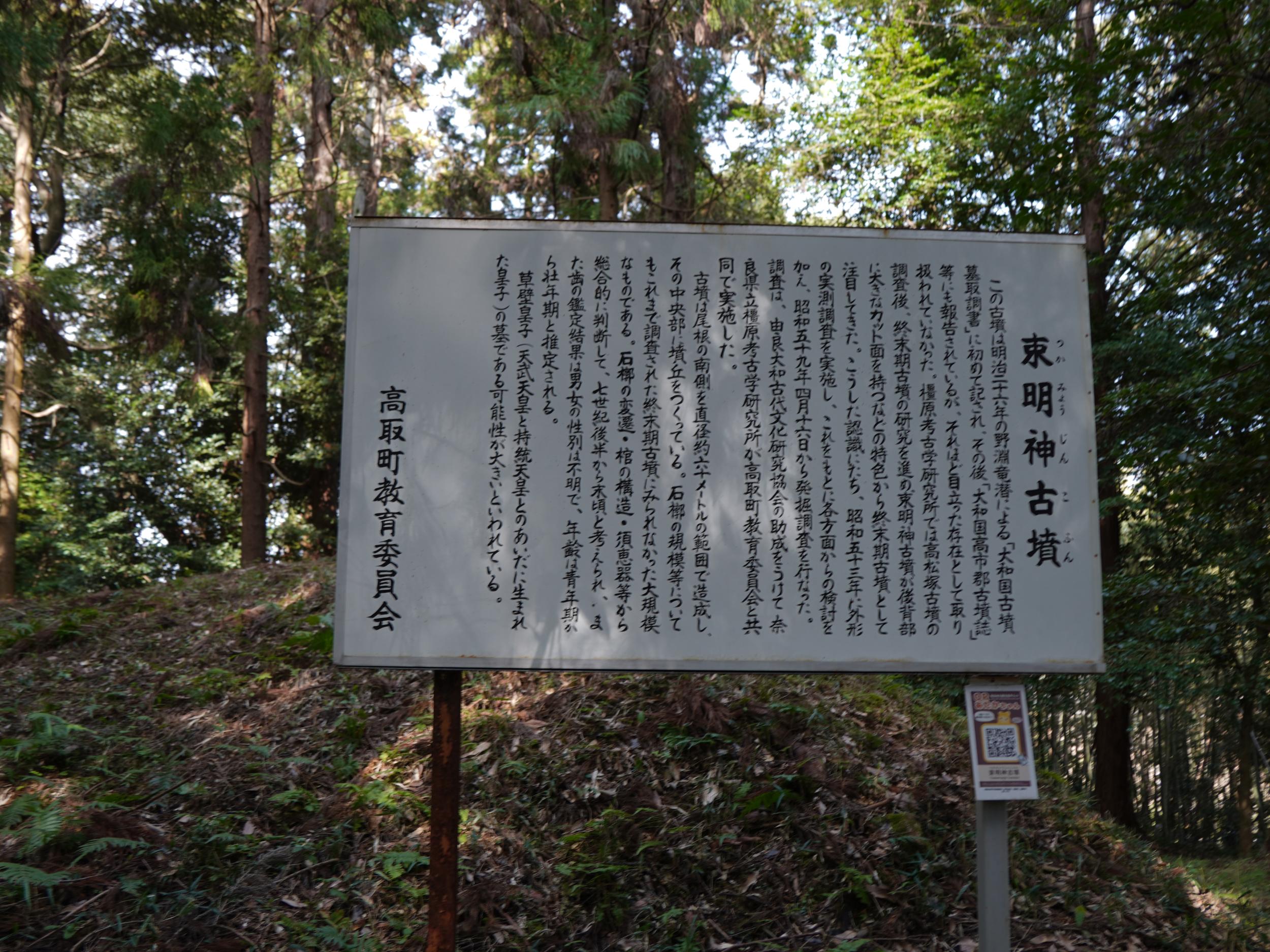 境内右手の低い土盛りが束明神古墳。終末期古墳で、牽牛子塚古墳や天武・持統天皇陵、中尾山古墳と同じ八角墳です。被葬者は天武・持統天皇皇子の草壁皇子の可能性が高いとのこと。