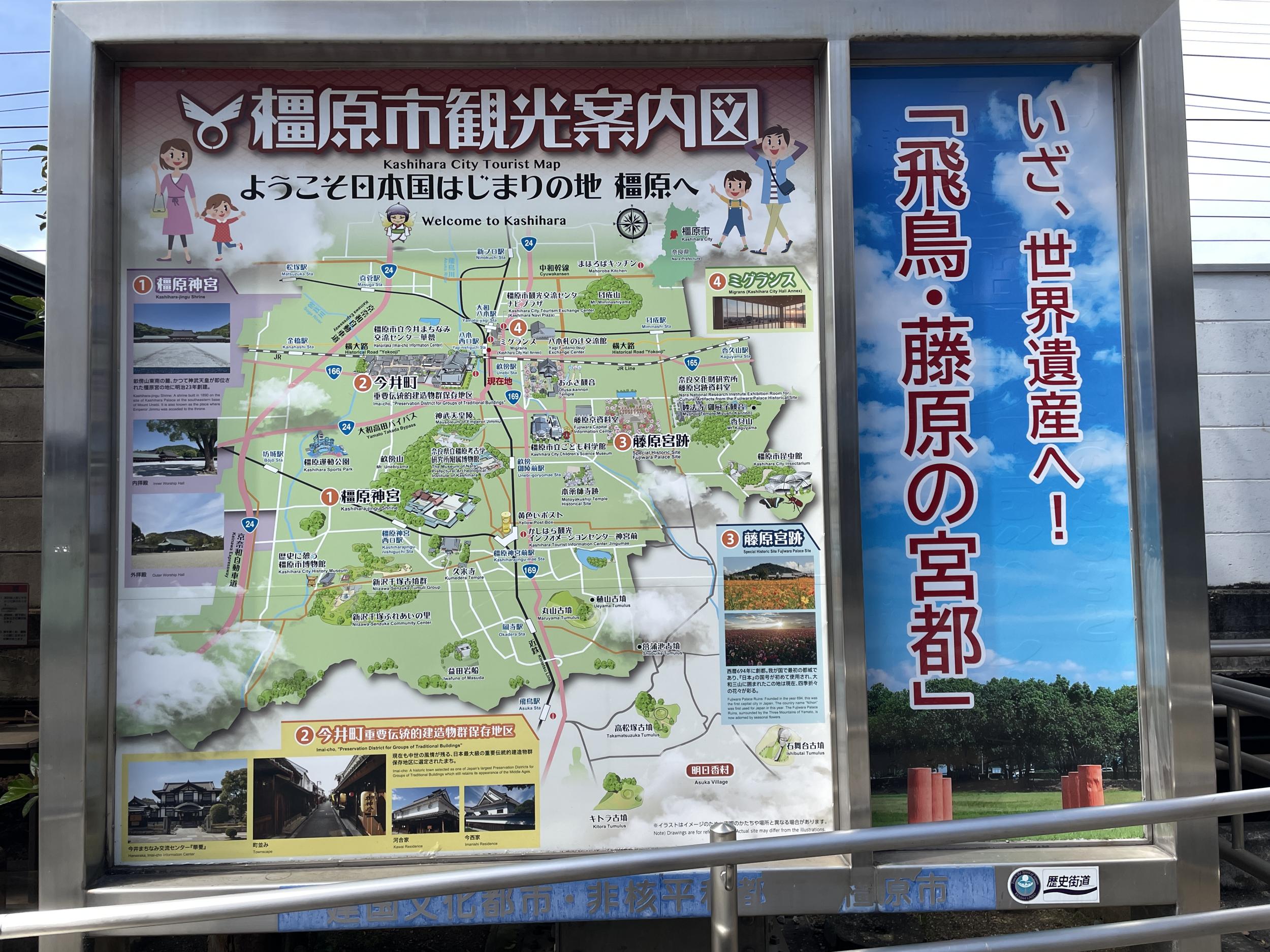 八木西口駅前の橿原市観光案内図です。「いざ世界遺産へ、飛鳥・藤原の宮都」と大きくあるものの、案内図でその対象となるのは藤原宮跡と本薬師寺跡だけ、橿原神宮や今井町は時代が違います。