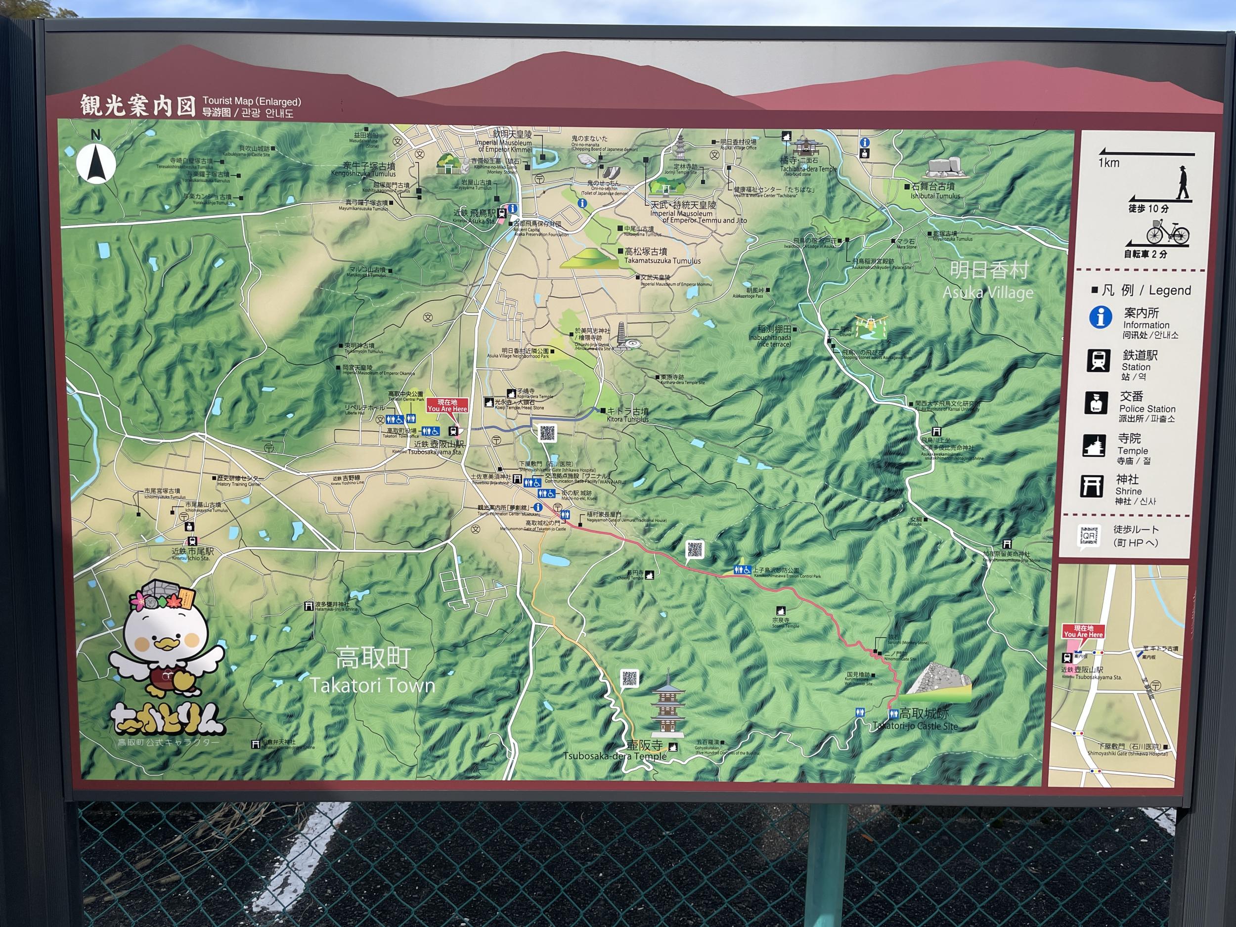 壺阪山駅にたどり着きました。ちょうど上り電車が発車したばかりで約30分待ちです。高取町の観光案内図を眺めていると、キトラ古墳、子嶋寺、上子島沢砂防公園、壷阪寺、それに今日歩いたところで、高取城を除き、概ね高取町全域をカバーできたようです。