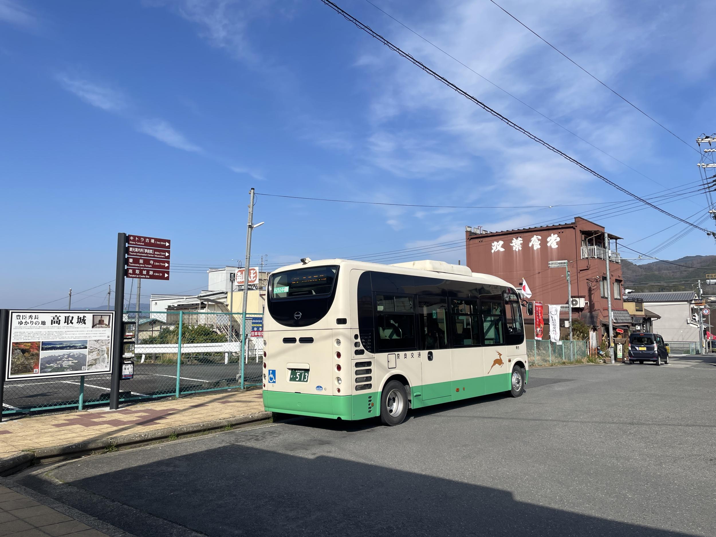 春分の日で日の丸を立てたバスは壷阪寺行、バスの向こうの双葉食堂でお好み焼きを食べたかったのですが、しばらくの間休ませていただきますとの張り紙。