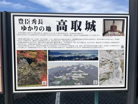 観光案内図の隣に新たに大河ドラマがらみで新しい案内板が立てられていました。高取が秀長ゆかりの地とは知らなかったのですが、大和郡山へ入城後、詰の城として高取城を大改修したのが秀長で、CGはその大改修後の高取城だそうです。CGの上には高取城国見櫓からの夜景、二上山の向こうに大阪が輝いてます。