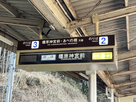 橿原神宮前で吉野線に乗り換え。当駅どまりの普通が到着、方向幕回転ショーを見物していると、区間急行下市口というのが出て来ました。2012年まで平日朝に1本だけ運転されていたらしい。