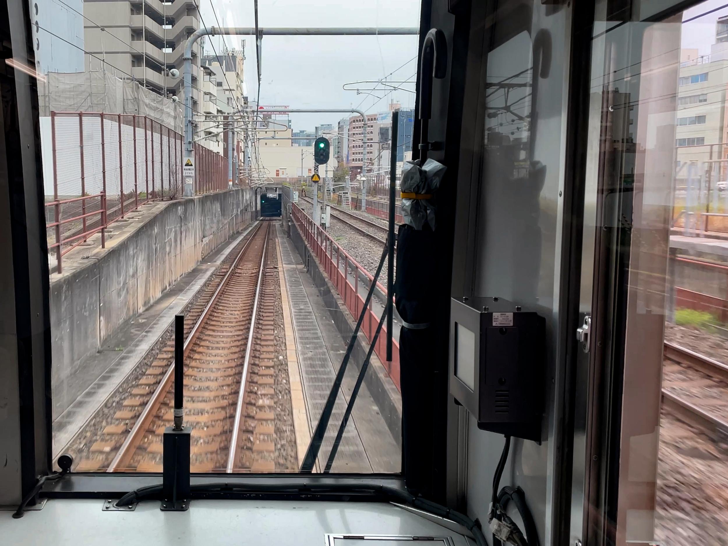 10:45の西明石行で旧片町駅付近で地下にもぐります。右手の空地に旧片町駅のポイントが草むら中に残されていると分かりました。