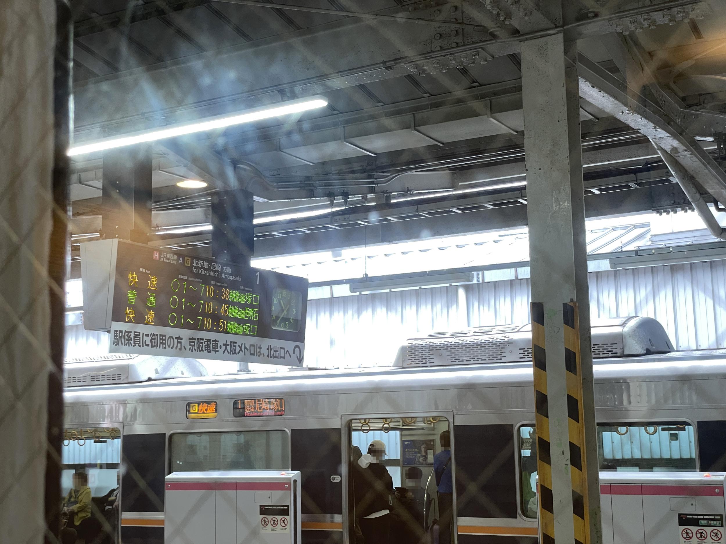 JR東西線京橋駅1番線に駅そばを見つけ、窓の外の発車案内を見ながら、肉そばと間違ってボタンを押してしまった肉うどんを食べているところです。