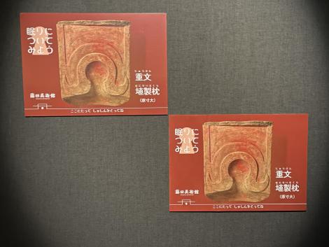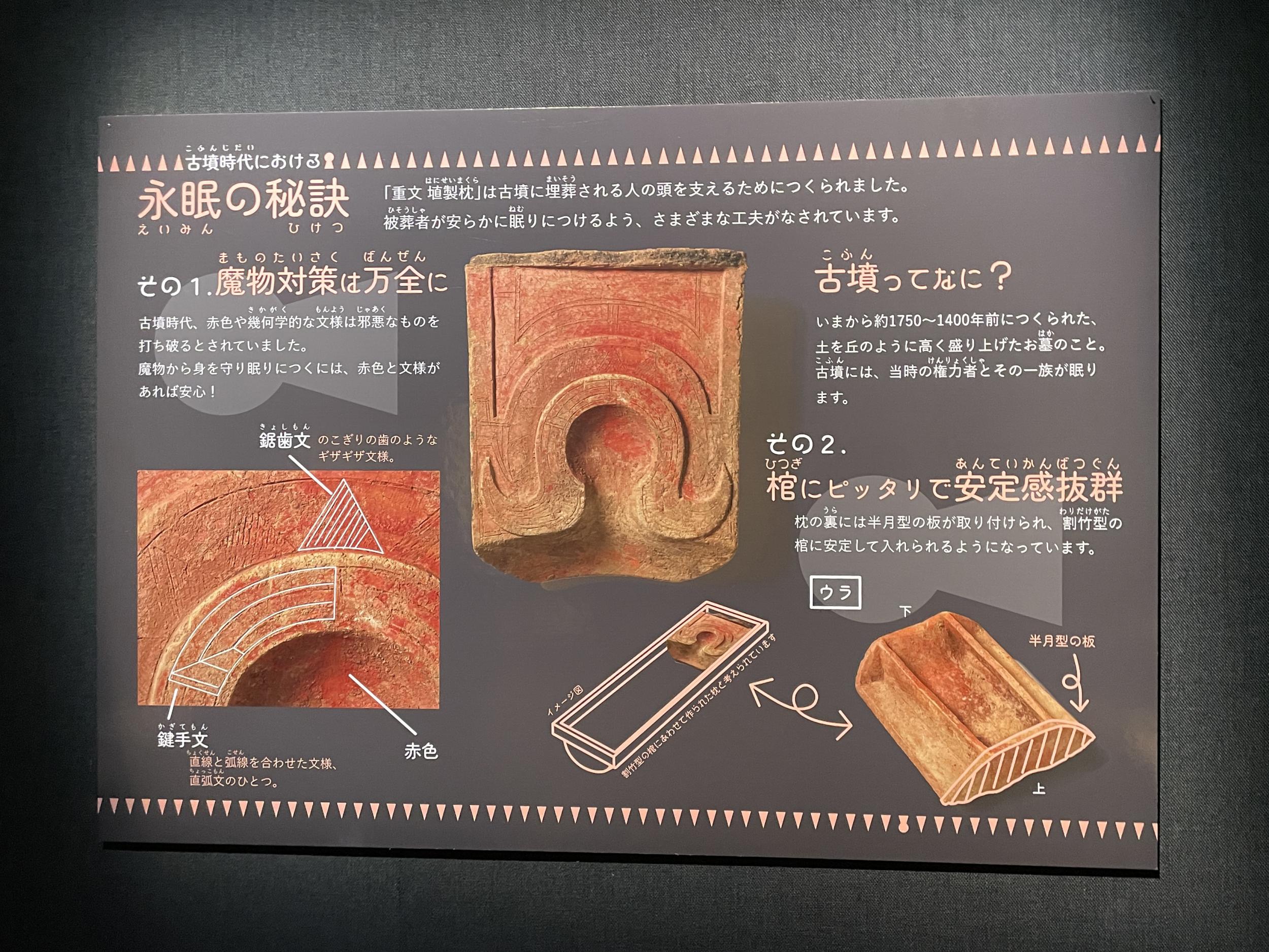 「古墳時代における永眠の秘訣」のパネルは、橿考研ではたぶん真似のできないノリ。さらに「眠りについてみよう」というパネル、埴製枕の頭の位置に自分の顔を合わせて写真を撮ろうというものですが、さすがに写真を撮っている人は誰もいませんでした。