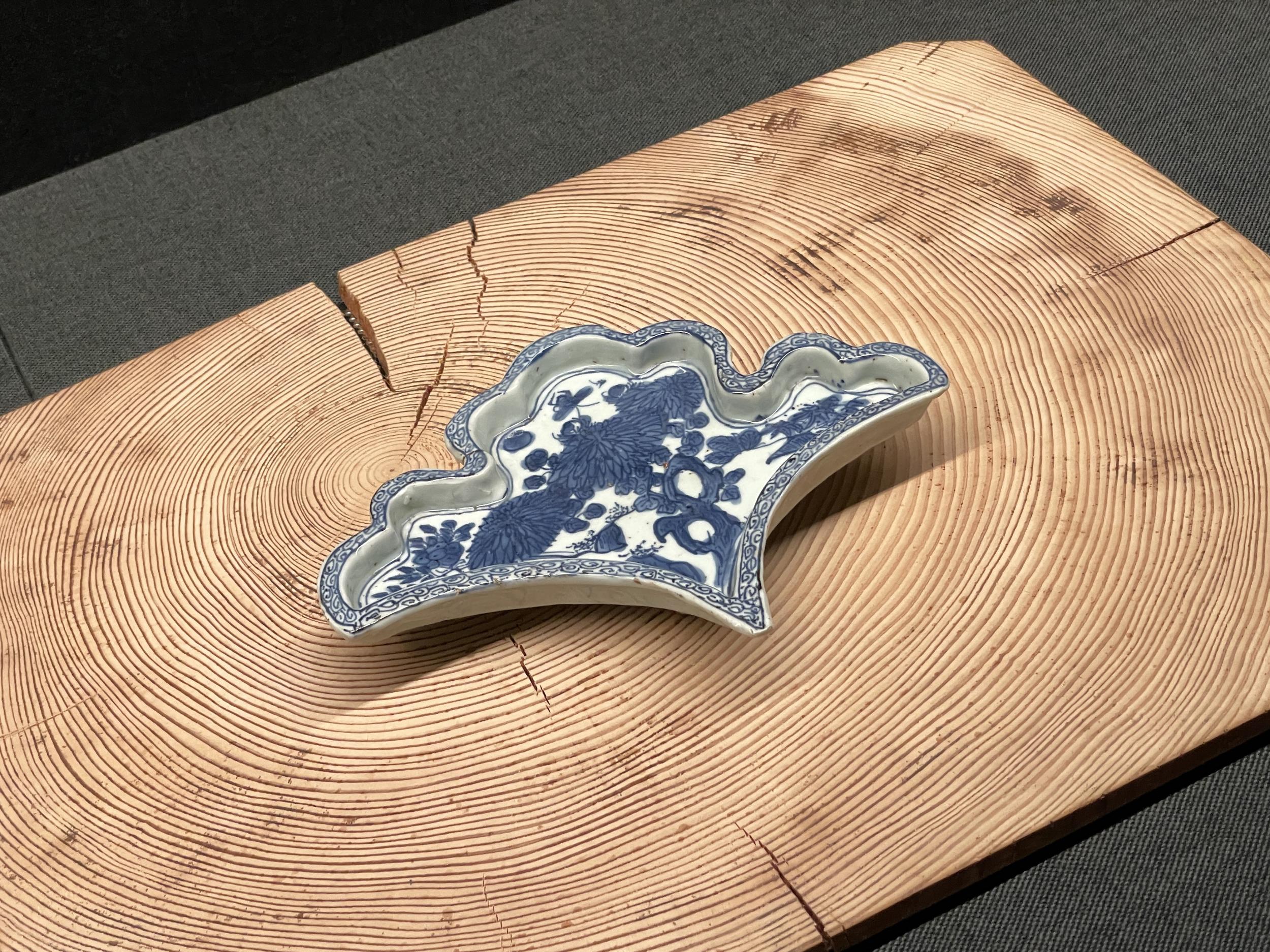染付銀杏形栗鉢(明時代、16〜17世紀)は景徳鎮窯の作。菊や蝶と縁には渦巻文が描かれたイチョウ型の染付、日本からの注文で焼かれ、小堀遠州を流祖とする遠州流茶席で水栗を出す時の栗鉢と見立てられていたらしい。水栗とは何か、どうやって作るか、どんな味か、詳しく紹介されている茶道の先生のウェブページを見つけました。