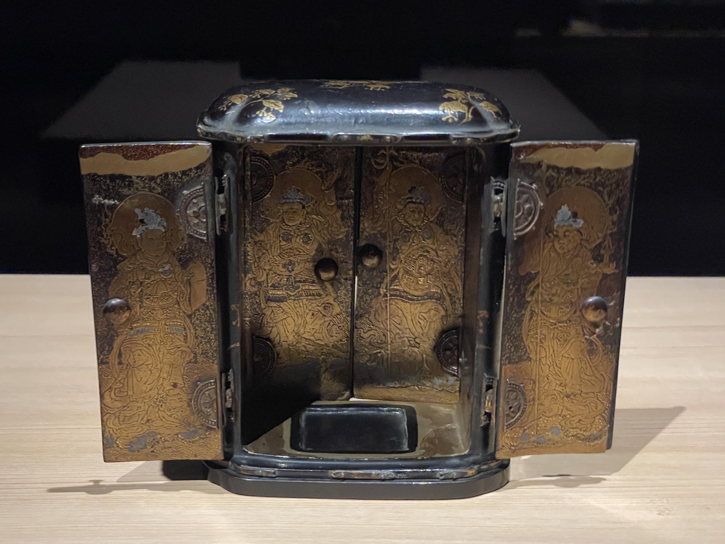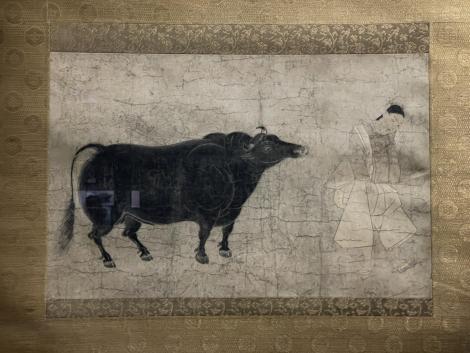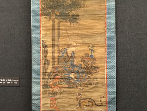 十六羅漢図のうち右第4尊者(明時代、14〜15世紀)は元時代の画家不気味でアクの強い作風で知られる顔輝作と伝わる羅漢図の一幅。切り株の卓にはガラスの鉢と青磁の花瓶、従者の手には彫漆の盆、背の高い木はなっている実から椰子ではなく棕櫚。
