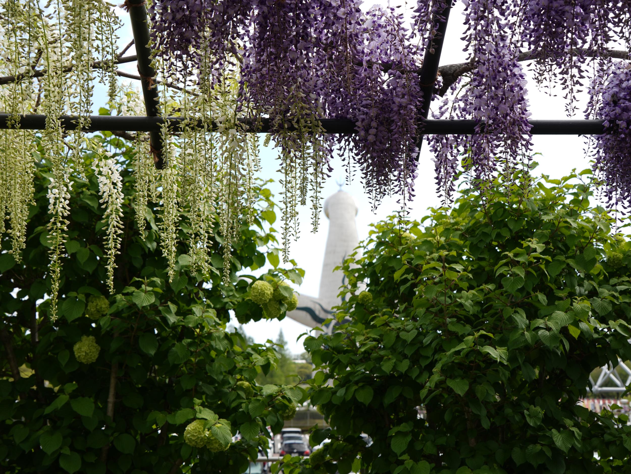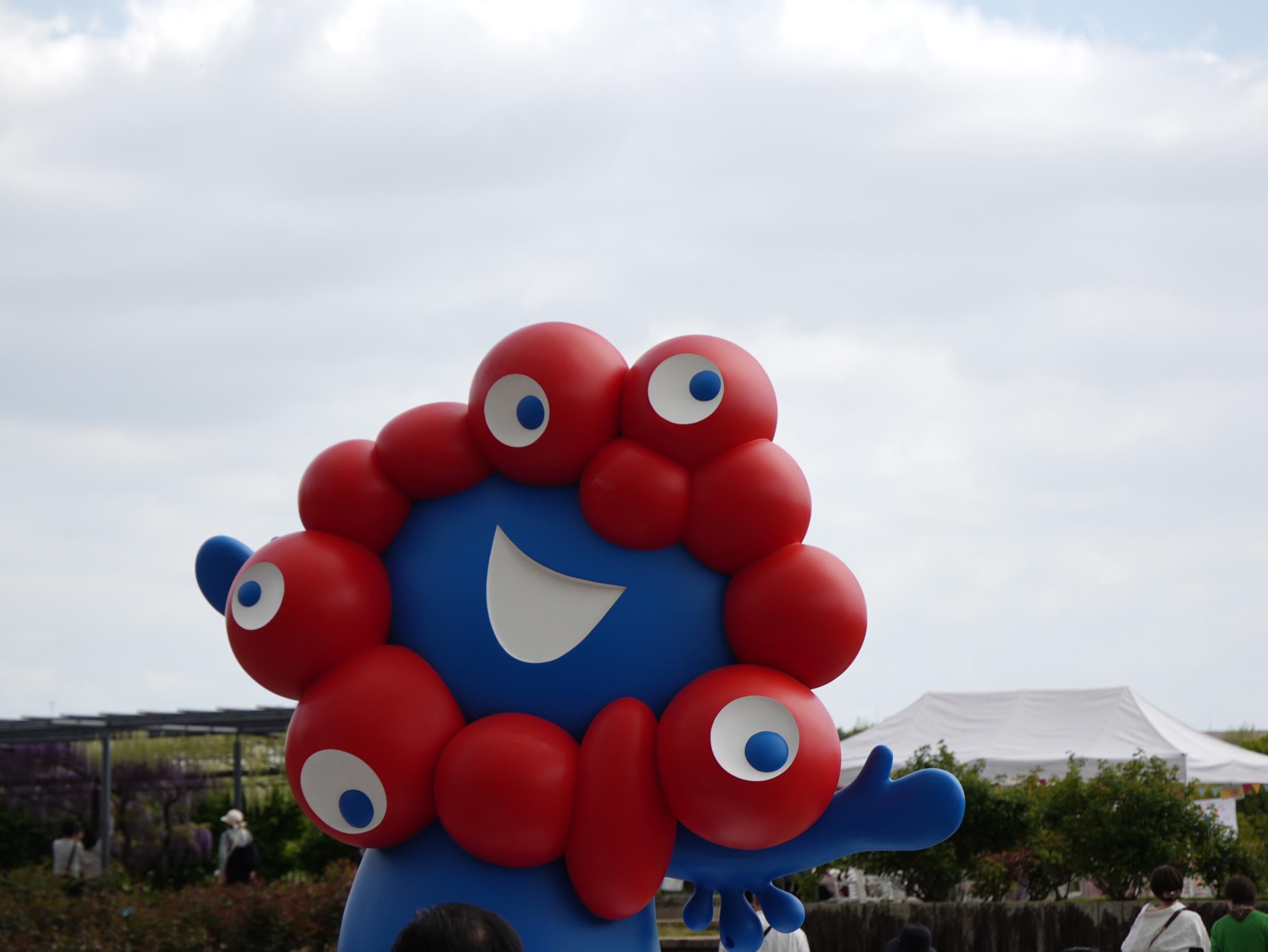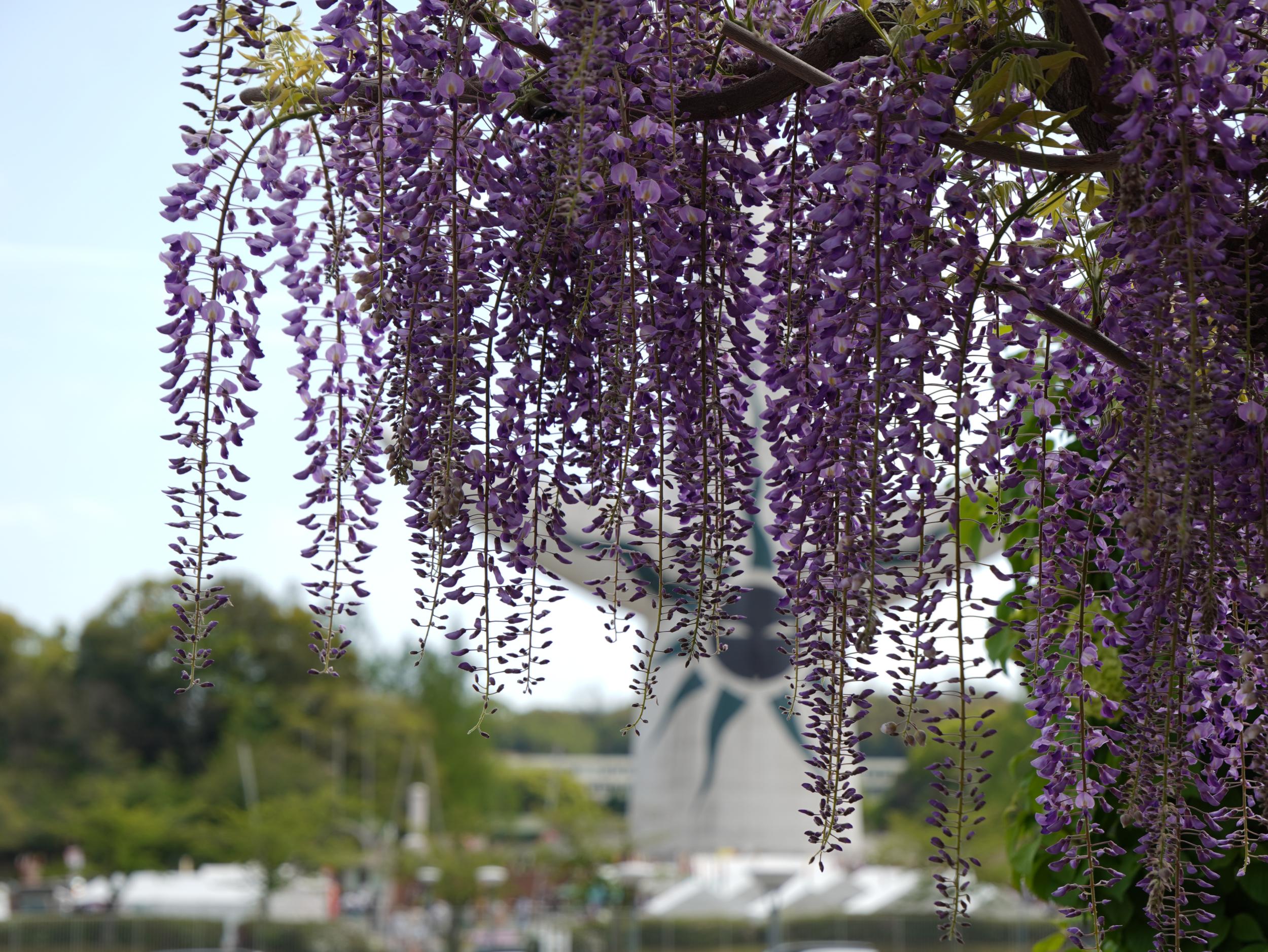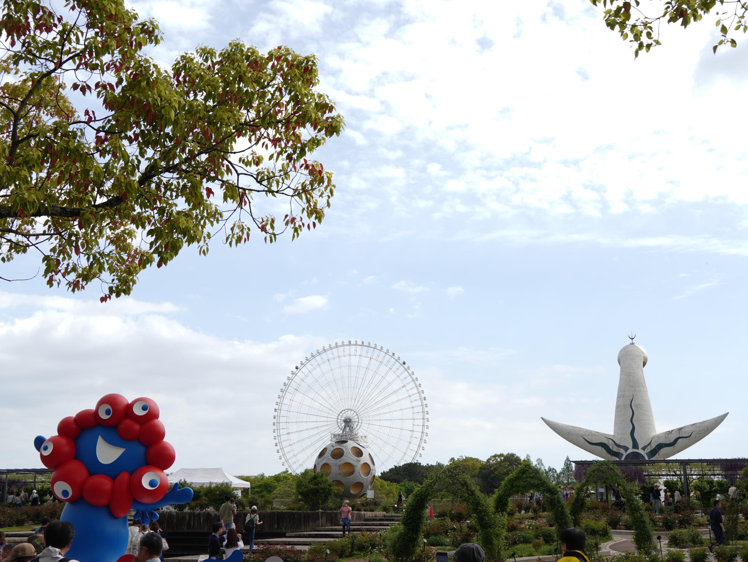 日本庭園前にやってきたミャクミャクは大人気で人だかり。太陽の塔とミャクミャクが並び、間にイサム・ノグチ「月の世界」と営業休止中のオオサカホイール。久しぶりにこの歌を聞きたくなりました。