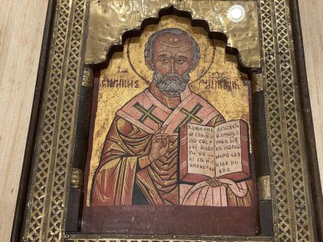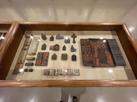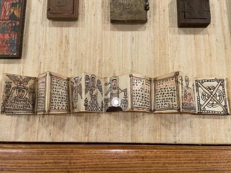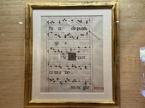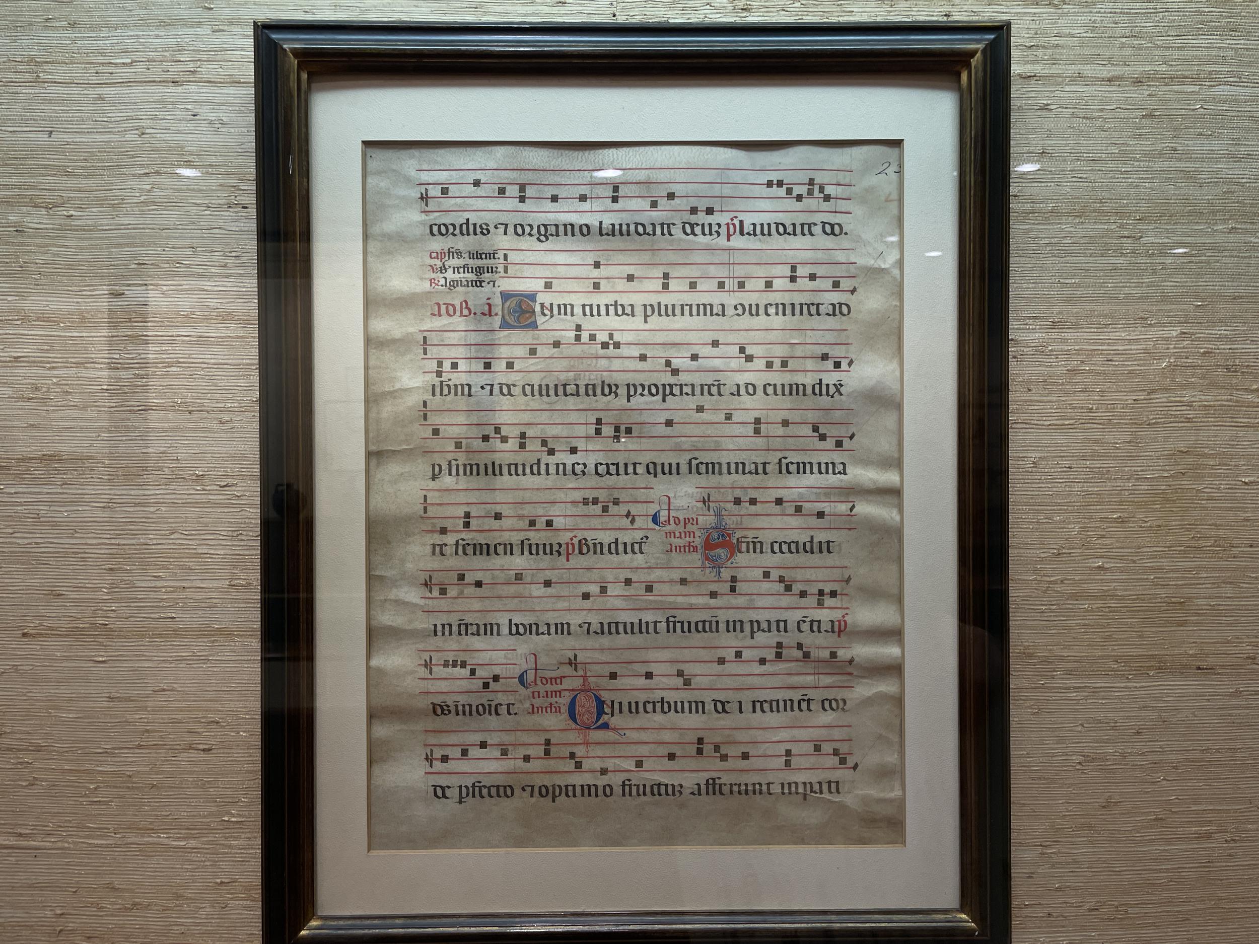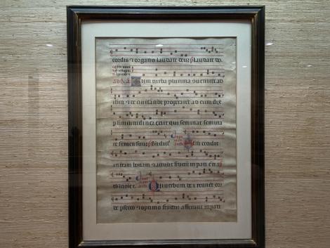 ところどころの壁に掲げられているのはグレゴリオ聖歌楽譜(イタリア)、14世紀の楽譜(写真14)と16世紀の楽譜(写真15)。五線譜ならぬ四線譜に四角い音符が並んだネウマ譜、歌詞はラテン語。14世紀の方は詩篇(たぶん)で、16世紀の方はルカによる福音書の種まきのたとえの部分らしい。