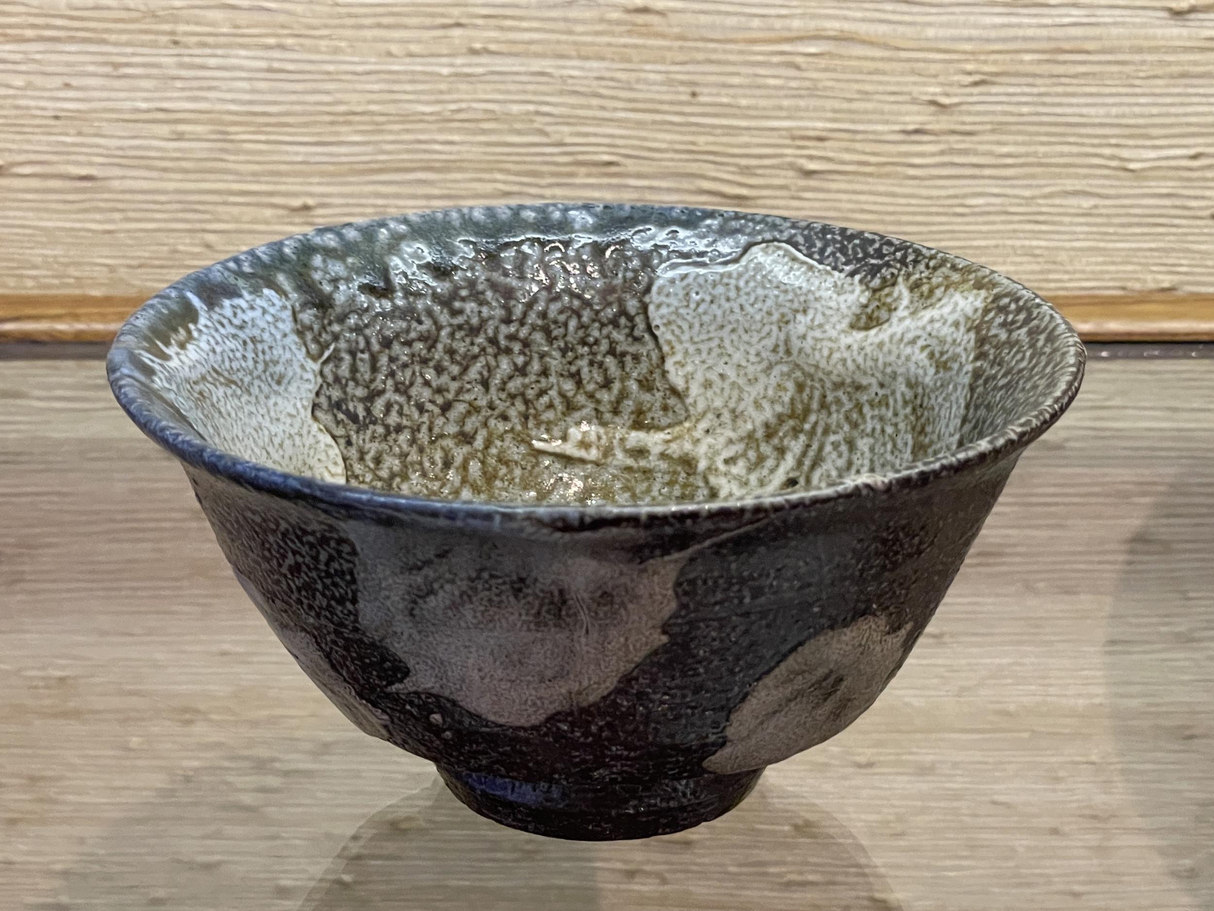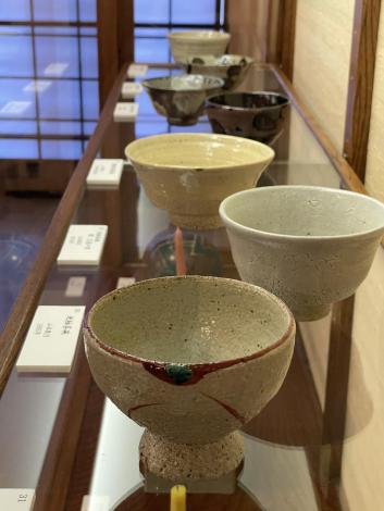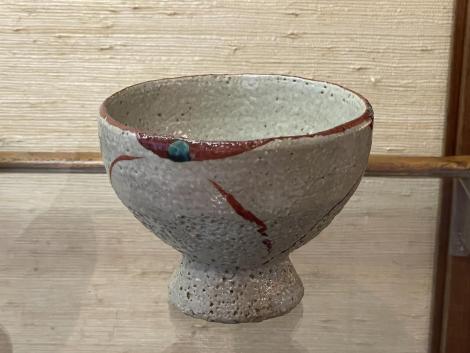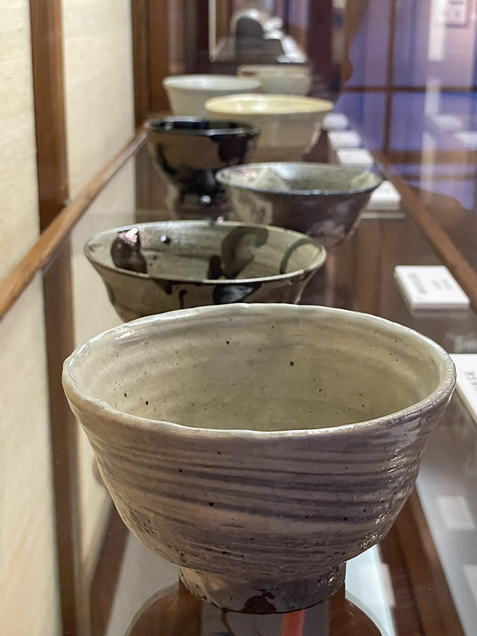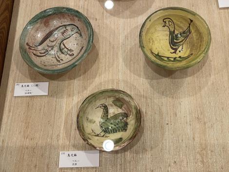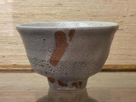 山本教行作・地釉茶碗(42)、塩釉打刷毛茶碗(43)、赤絵茶碗(44)。赤絵茶碗は濱田庄司の組重⑫と同じ色使いです。