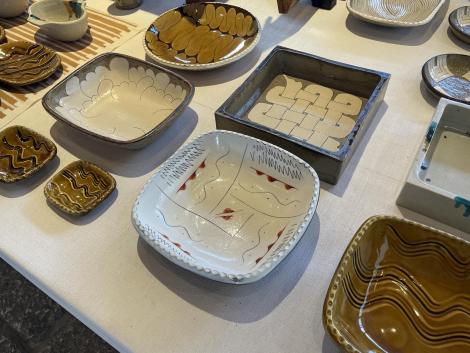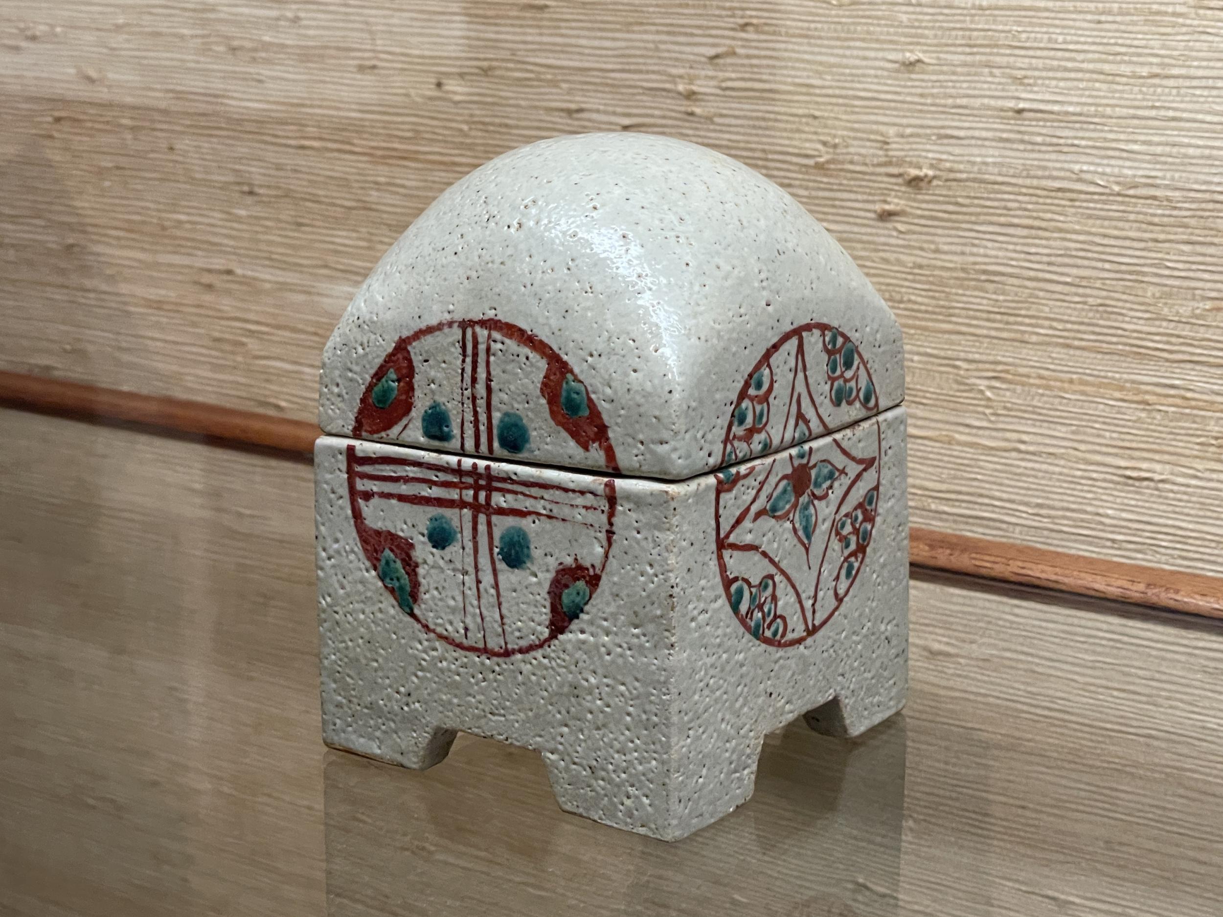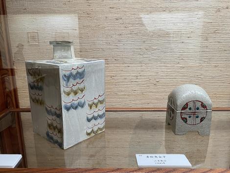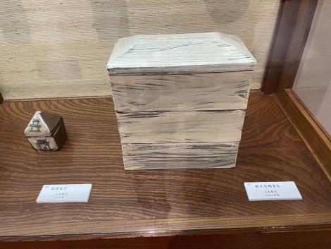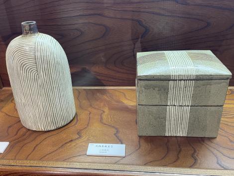 家図盒子と濱田庄司の組重⑫と同じ形刷毛目陶重筥(48)、灰釉象嵌扁壺と灰釉象嵌重筥(49)。