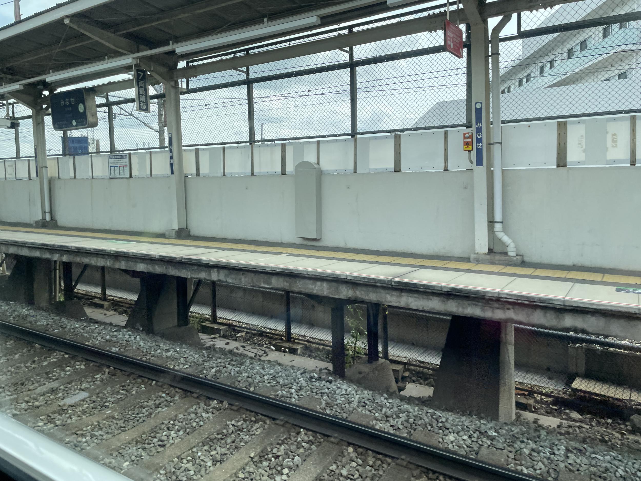 高槻市を過ぎて新幹線の並行する辺りまで進み、水無瀬駅と分かりました。ホーム柵も無いので忍者のように壁にへばりつくしかありません。10年ほど前、コミミズクで何度も通った水無瀬です。