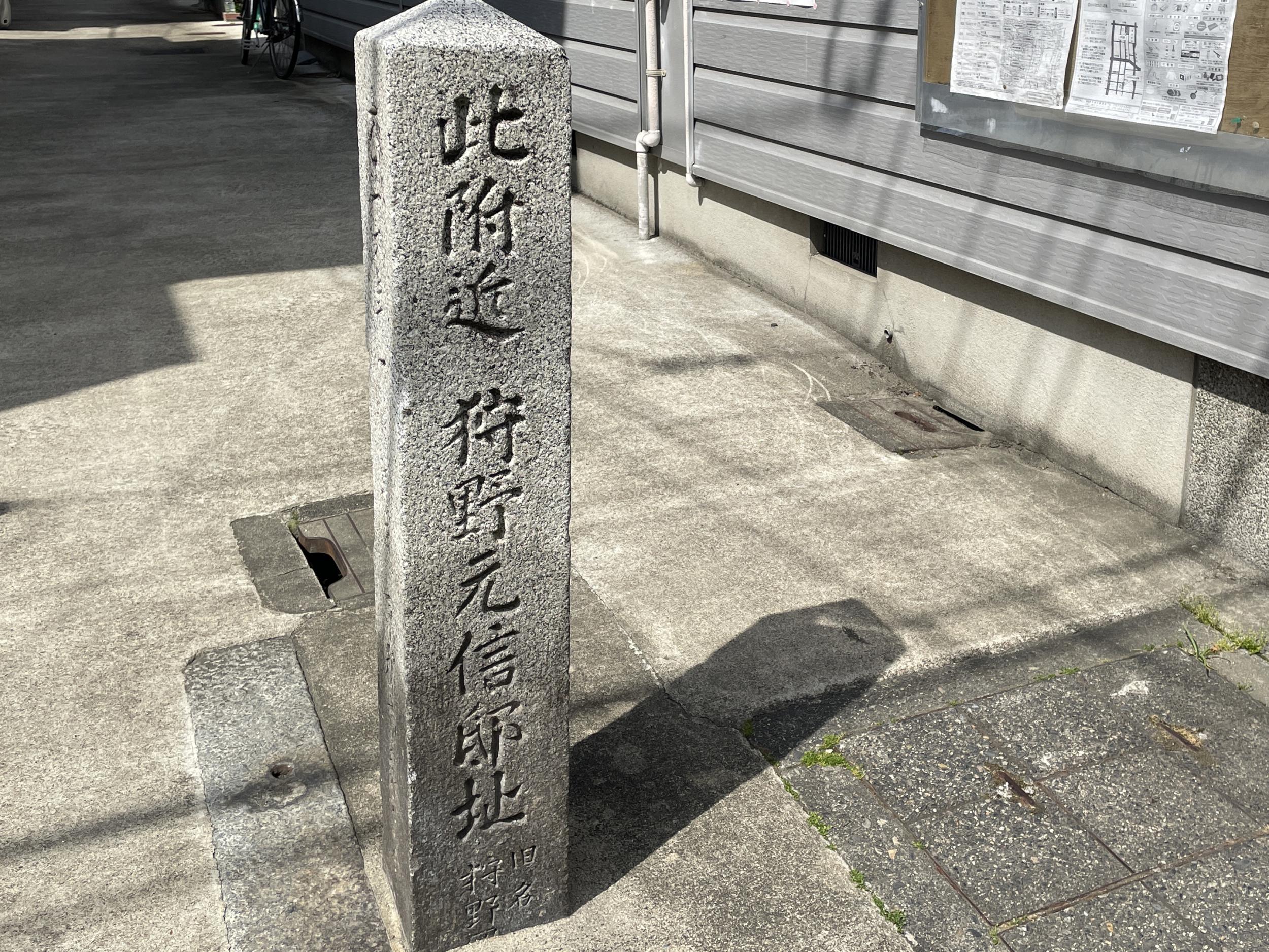 典厩邸や細川邸より小さくなった幕府、それでもしっかり枯山水の庭が美しく描かれていて、政治力は小さくなったものの、文化の面では依然として権威を保っていた室町幕府です。同志社寒梅館の敷地に残る敷石の遺構はまさにこの柳原御所の築地塀の基礎部分らしい。「此付近狩野元信邸跡」の石碑からたっぷりと室町時代の京散歩が楽しめました。
