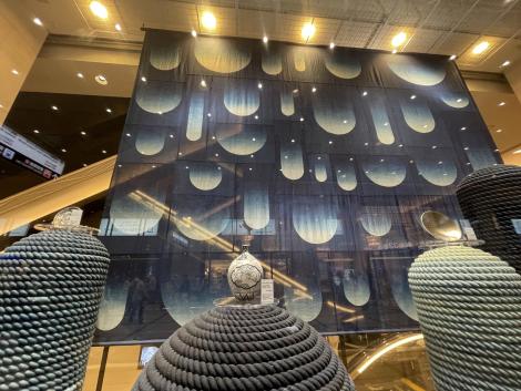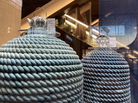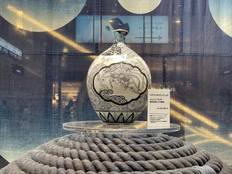 翌日曜日、阪急百貨店のJapan and meが気になって再び梅田へ。ARITA PORCELAIN LABという窯元のJAPAN SNOWとブランド名の付いた花瓶とティーポット、銘々皿です。花瓶には鳳凰と桜、ティーポットは草花文とあるものの、何やらサンリオのキャラクターを彷彿とさせます。展示台は藍染の縄と気づきました。色合いの変化がとても美しい。縄だけだと何か分からなくなりますが、磁器が上に載ることで縄の美しさが際立っています。