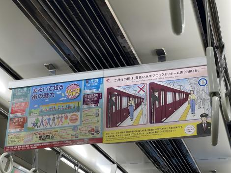 9300系特急車内に「ご通行の際は、黄色い点字ブロックよりホーム側(内側)を」という中吊り。中津駅や春日野道駅はどうするんや、と突っ込みたくなります。もうひとつ極端に狭い駅があったはず、どこやったかな…。