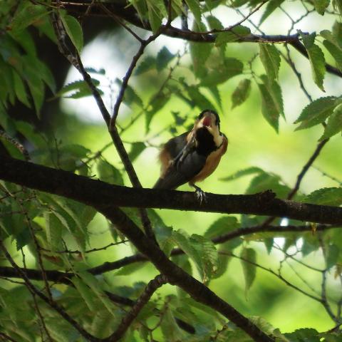 片足上げて、大きな口を開けてあっけにとられたような顔、エゴノキの種を落っことしてしまったのかな?
