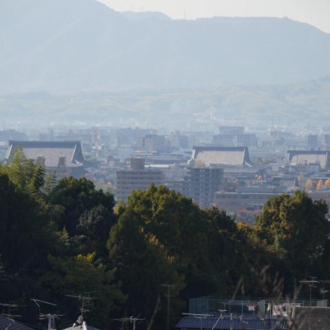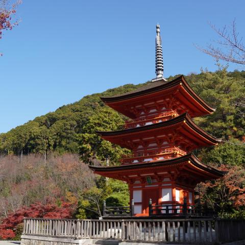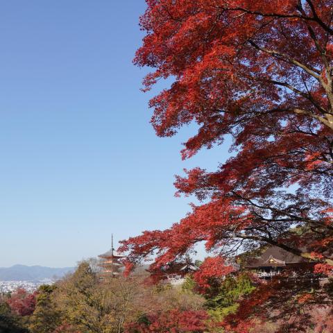 三重塔とモミジと京の町